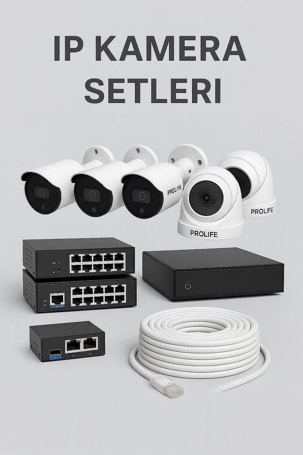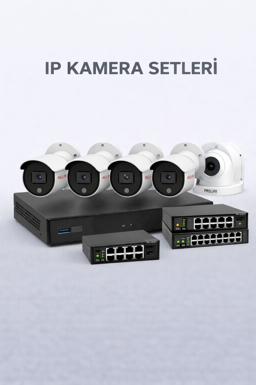 Prolife ürün portföyünde IP kamera setleri, AHD kamera setleri, DVR ve NVR kayıt cihazları yer alır. İhtiyaca göre PoE destekli IP kameralar veya klasik kablolu kamera sistemleri tercih edilebilir.
