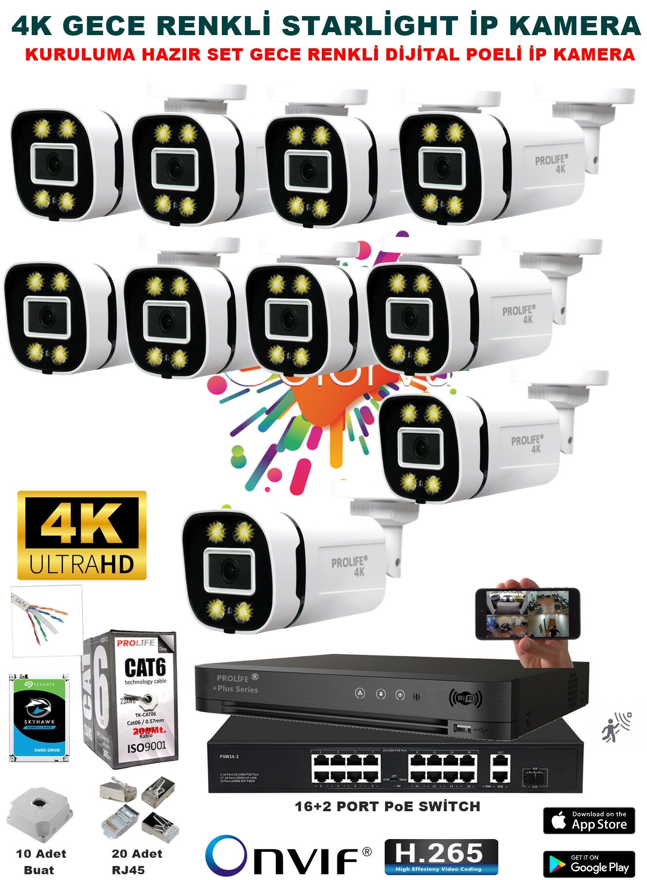 PROLİFE | 4K / 1440P Gece Renkli, Sesli, Yapay Zekâ Destekli IP Güvenlik Kamera Sistemi