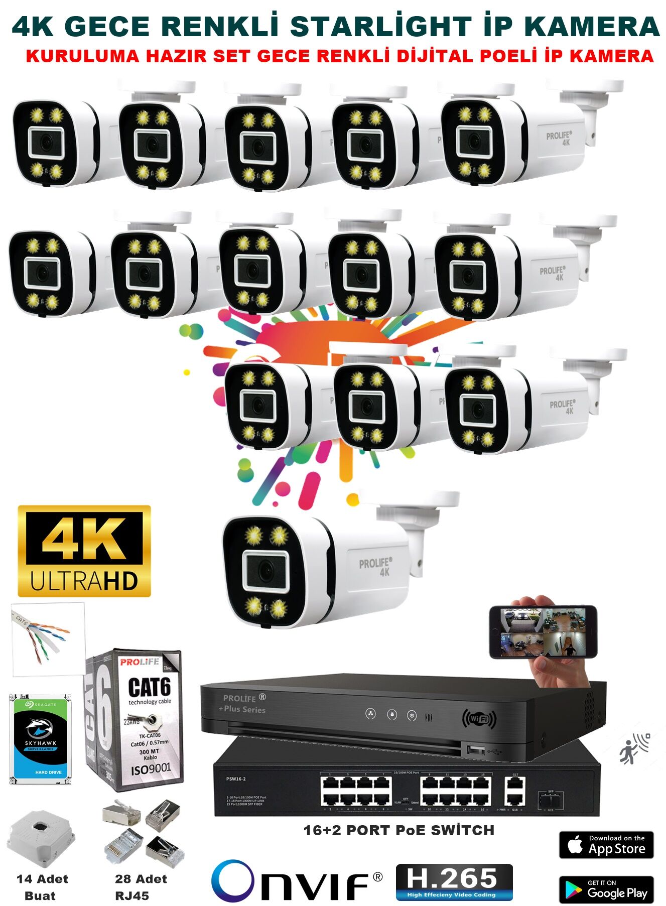 14 Kameralı Sesli 4k 1440p Full Hd Poeli Ip Kamera Gece Renkli Ultra Hd Çözünürlük Kamera Sistemi