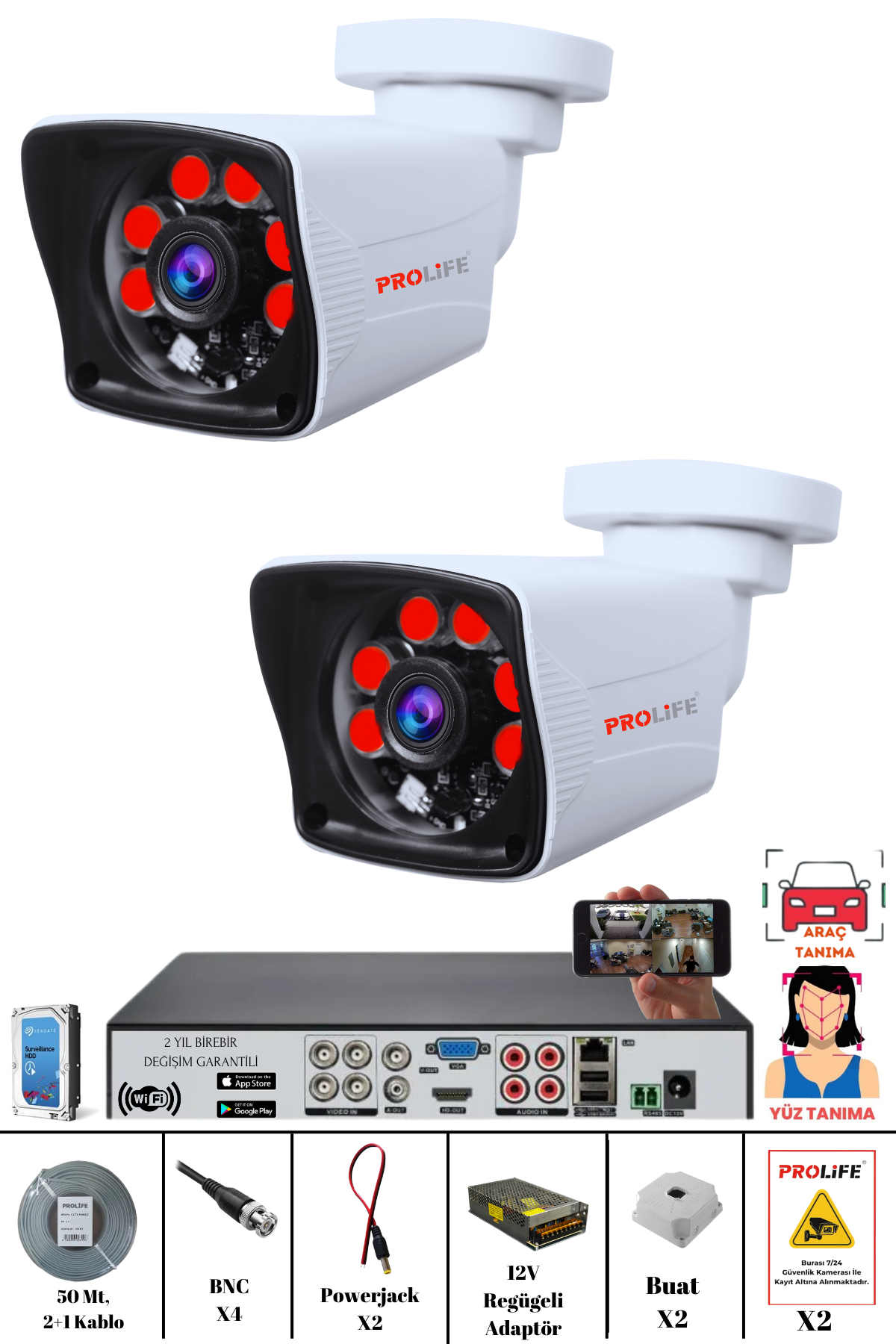- 2 adet PROLİFE 5 MP AHD Güvenlik Kamerası