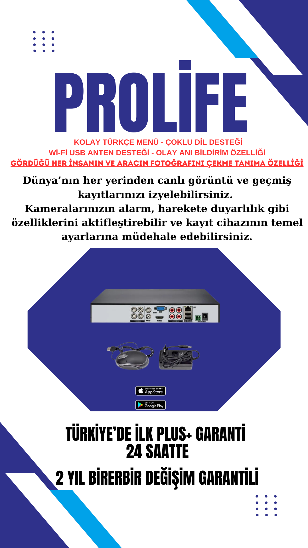 - 1 adet PROLİFE PR-804 4 Kanal (5MP) Kayıt Cihazı Adaptör ve Mause Dahil