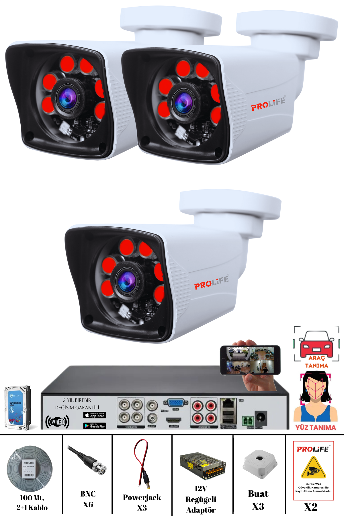 PROLİFE 3 Kameralı Yapay Zekâ Destekli 5 MP Profesyonel Güvenlik Kamera Sistemi