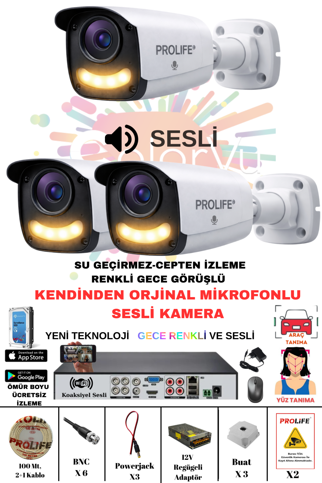 PROLİFE PLUS+ Serisi | 3 Kameralı Sesli, Gece Renkli, Yapay Zekâ Destekli 5 MP Profesyonel Güvenlik Kamera Sistemi