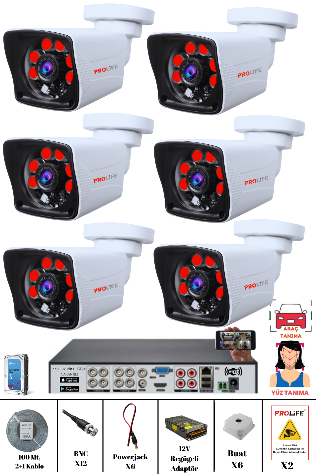 - 6 adet PROLİFE 5 MP AHD Güvenlik Kamerası