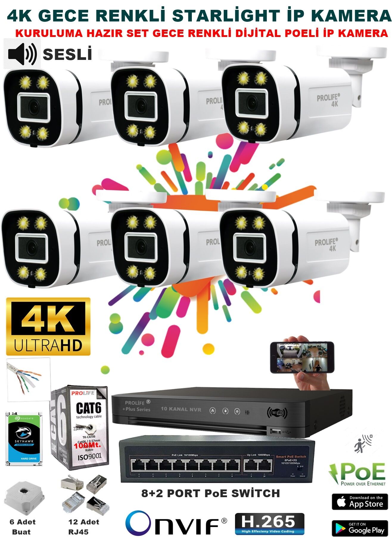 - 6 Adet PROLİFE 4K / 1440P IP Sesli Poe'li Güvenlik Kamera