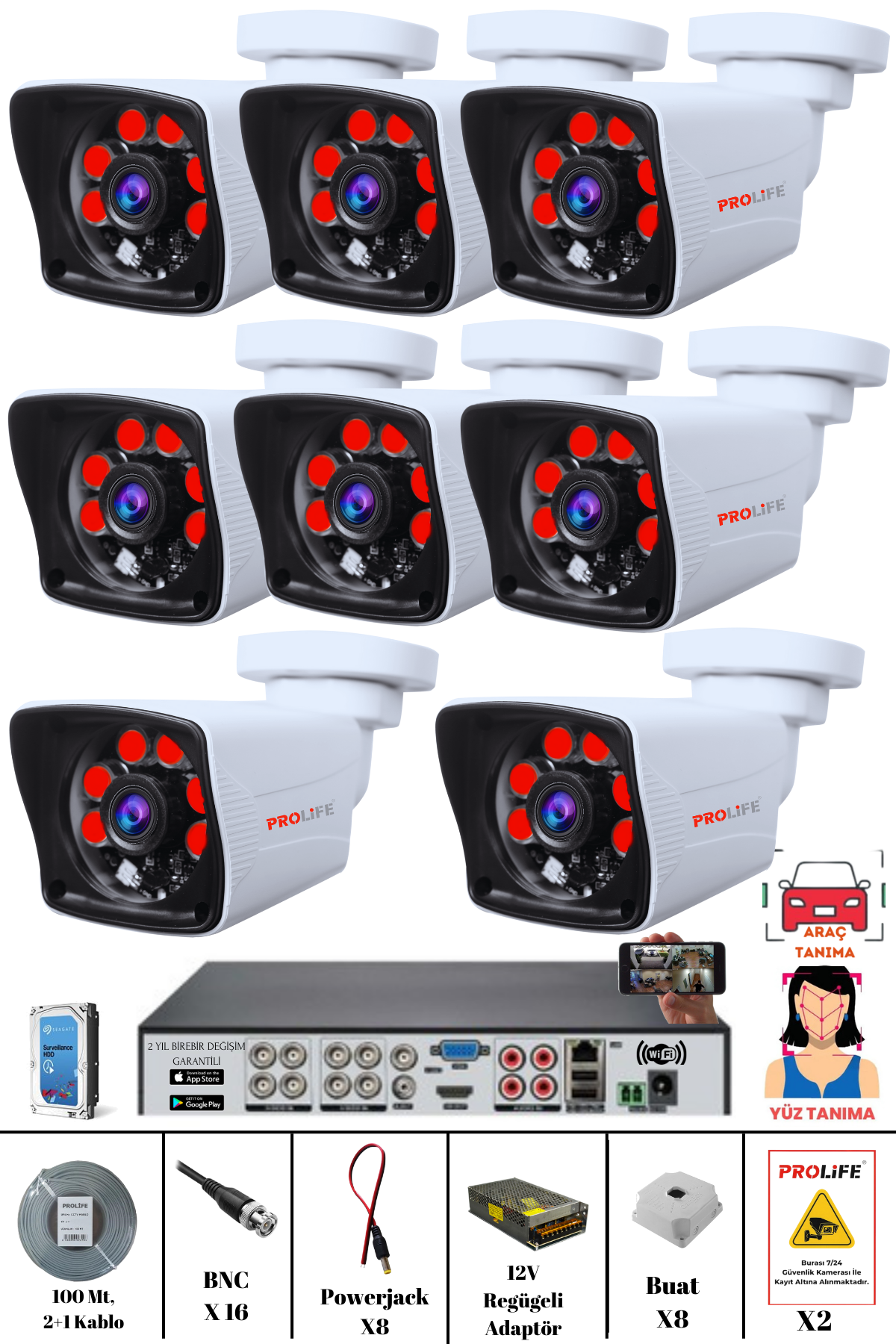 - 8 adet PROLİFE 5 MP AHD Güvenlik Kamerası
